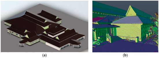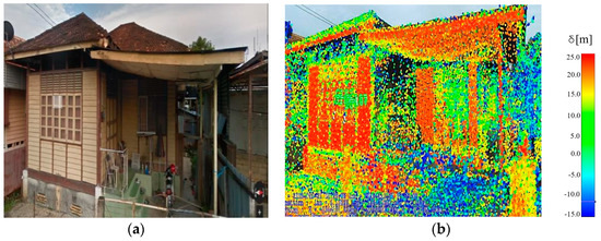 (a) Highlighting the surface of a Malay building façade in study area; (b) color-coded 3D point cloud indicating overlapping point clouds.