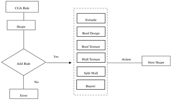 Process of assigning rules using Computer Generated Architecture (CGA) in 3D model construction.