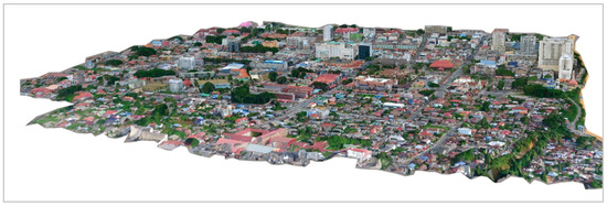 The digital aerial images were processed using Agisoft photoscan. The triangulation was performed, then the digital surface models (DSM) and orthophoto were generated. The orthophoto image in Figure 6 shows the 3D modelling that resulted from the data captured by the drone. The image also contains the point cloud information that can be fused with MLS data. The orthophoto captured the building footprint of the city, which was used as a base for the 3D building models that were later generated. The orthophoto successfully generated roof and wall faces based on photogrammetry stereo measurement, which also reduced the processing time for constructing the building models. The image was processed for the final output considering specified parameters to ensure the quality of the result. During the image processing, the parameters of tie points were produced, representing pairs of pixels that corresponded to the same locations where the images overlapped, and creating thousands of key points for each image. The connecting points that reflected the same area were compared in different images to evaluate where the images intersected. We used the matching image pair variables to sort the image pairs related to the key points. The aerial grid technique was used to organize an image along a grid or corridor (straight line) flight path. The point cloud densification was completed in the next stage with a textured mesh process. The output of the 3D mesh clearly illustrated the buildings as shown in the original UAV images.