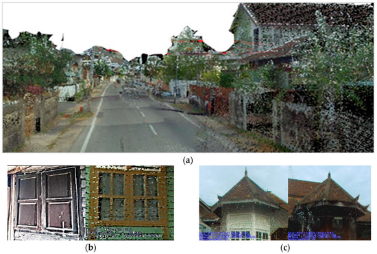 Urban scene mapping and modeling based on MLSs. The Malay urban façades were captured using the more detailed MLS point clouds; (a) overall Malay settlement, (b) wall, and (c) roof.