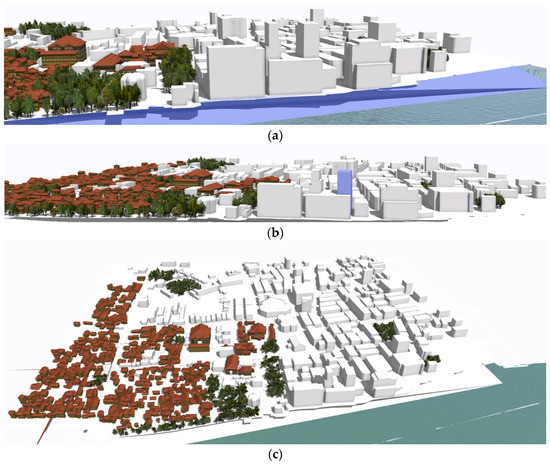Block massing results of different perspectives on the Kota Bharu Malay heritage city 3D scene obtained by fusing drone and MLS data (a). (b) East side and (c) North side.