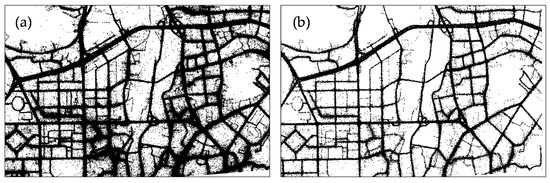 After that, a sophisticated thinning algorithm was utilized to generate road central lines from the trajectory images processed by the above dilation and opening operations. Image thinning, or skeletonization, is the process of obtaining the skeleton graph of objects from binary raster images. There are two representative thinning methods, i.e., iterative methods and non-iterative methods. In view of image noise immunity and preserving road completeness, we adopted the sophisticated iterative method, based on mathematical morphology in this paper. In detail, the target image A was iteratively thinned by a set of structuring elements {B1,…,BN} according to Equation (1). The morphological thinning operator was to set the pixel values as 0 when they are hit by the structuring elements B1,…,BN. The single-temporal road network can be obtained by inversely converting the thinned images to the vector skeleton map. Other temporal road networks are similarly extracted by the above mathematical morphology method.