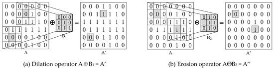 In theory, morphological operations contain two basic operators (dilation and erosion), as well as some other derived operators (e.g., opening, closing, and thinning) [41]. As illustrated in Figure 2a, the dilation operator of binary image A by structuring element B1 is defined as A⊕B1 = {x, y|(B1)x, y∩A ≠ ∅}. Like that shown in Figure 2b, the erosion operator of binary image A by structuring element B2 is defined as AΘB2 = {x, y|(B2)x, y⊆A}. It can be seen that the dilation operator aims to expand the shapes of binary image A, and, conversely, the erosion operator aims to thin the shapes of binary image A and remove the crack edges.