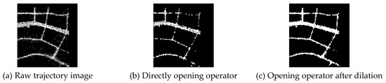 The vector trajectory data in each temporal clique were first converted into binary raster images with two specified grid and density thresholds. After that, road features were then extracted by a dilation–opening–thinning operator strategy. First, to decrease the impact of coarse sampling, a dilation operation of structuring element B1 was necessarily performed to expand the shape of the road regions and to connect the fractured road segments. Then, we executed an opening operator on the binary trajectory image after dilation. The opening operator is a derived operator which executes the basic erosion and dilation operators in order with the same structuring element B2. As illustrated in Figure 3, Figure 3b is the result of directly performing an opening operator on the original trajectory image in Figure 3a, and Figure 3c is the result of performing the opening operator after a dilation operator on the original image. It can be seen that compared to directly performing the opening operator (Figure 3b), the geometric characteristics of the road segments are better preserved by adopting the dilation–opening operators (Figure 3c).