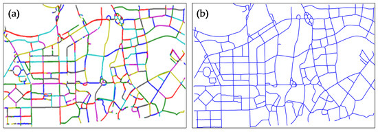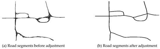 According to the physical gravitation force model, the optimal new position of each vertex t in one road segment Ri is calculated and updated iteratively by making the sum of the gravitation forces of other road segments {R1…Rj…RN} (j ≠ i) equal to the spring force of moving the vertex t to a new position x, i.e., F1(t) = F2(t). The positional adjustment process of that road segment Ri will terminate when the positional differences of all vertices between two iterations are smaller than a specified value. All K-temporal corresponding road segments are spatially adjusted by the same gravitation-force-based fusion process. Figure 5a shows some examples of K-temporal corresponding road segments extracted from K partitioned trajectory datasets, and Figure 5b shows those road segments after positional adjustment, which indicates that the geometric deviation between different temporal road segments is efficiently improved to generate a geometry-consistent road network.