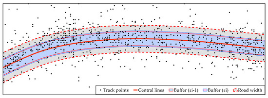 Road Width Computation: For each road segment, we started to build its buffer region with a radius of ε0 and compute the ratio r0 of the trajectory points that fall in the buffer region buffer (ε0); then, we rebuild the buffer region with an increasing radius of εi = ε0 + i*s (where i is the iterative number and s = 0.1 m is the iterative step) to compute a new ratio ri of trajectory points falling in the buffer (εi); the above buffer analysis continues until the trajectory point ratio ri reaches 96%, and the buffer radius after iteratively buffering is inferred as the road width W (shown in Figure 6).