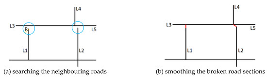 Due to coarse sampling or two-way-road reconstruction, some generated roads may be disconnected or misconnected with other roads. In view of preserving road connectivity, a post-processing of topology reconstruction was necessarily implemented. First, to distinguish the dead-end roads that are generally far from other roads, we used a very small search radius (e.g., 1 m) to find the connected-end roads and to repair their topological relations with their neighbouring roads. As illustrated in Figure 7a, if only one neighbouring road at one node is found, the road node of L1 will be extended straight to the unique neighbouring road (Figure 7b); otherwise, that road node of L2 will be extended by inserting a new segment consisting of the nearest node and the road node itself (Figure 7b). Certainly, a fixed search radius may not be enough to judge dead-end roads and connected-end roads. It could be better to combine the spatial proximity of road segments and the topological connectivity of the associated trajectory lines to deal with these singleton segments.