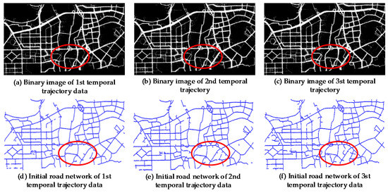 Figure 8 illustrates the results of road network initialization, based on the morphological rasterization method. Figure 8a–c shows the binary images converted from three-temporal trajectory data and Figure 8d–f shows the road networks roughly extracted from the aforementioned three-temporal binary images. It can be seen from the red ellipses in Figure 8 that spatial inconsistencies and complementarities coexist in different temporal road networks because of spatio-temporal heterogeneities between trajectory data. The proposed K-temporal extraction strategy can efficiently discover the spatio-temporal road change characteristics that are implied in continuously observed trajectory data, providing significant clues for road change detection and self-updating. Moreover, the K-temporal road network initialization method can cause efficiency promotion, in comparison to directly extracting the road network from the whole trajectory dataset. In practice, it is a feasible solution to utilize parallel computation to further decrease the time consumption of K-temporal road network initialization.