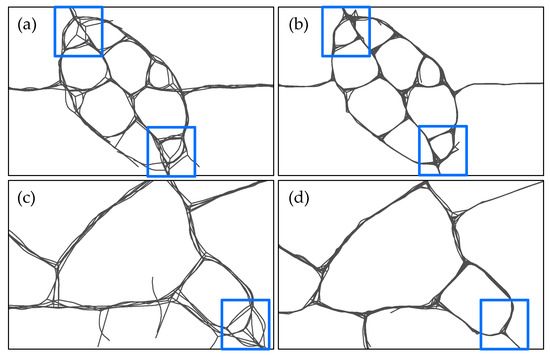 Figure 9a,c depicts the results of overlaying the K-temporal road networks extracted by the rasterization method, and Figure 9b,d elaborates on the spatial adjustment results based on the gravitation force model. As shown in the blue rectangles in Figure 9, the geometric deviations between different temporal road networks are efficiently improved by the force-based fusion model, improving the geometric accuracy of the generated road networks.