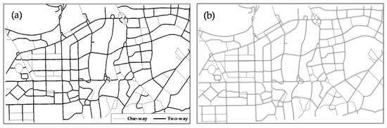 Based on the heading distribution of the associated trajectory points, the driving rule of each individual road segment can be identified as of two types, i.e., one-way and two-way. Figure 11a displays the identified one-way (grey line) and two-way (black line) road segments, indicating that a large proportion of road segments are two-way roads, and the one-way roads are mostly low-level streets or road intersection segments. Figure 11b shows the results of two-way road reconstruction. The experimental results illustrate that the trajectory data provide a rich and timely source to mine both the geometry and semantic information of urban road networks.