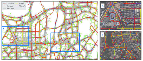 Overlaying the road networks extracted by our method and another three methods from [27,34,39].