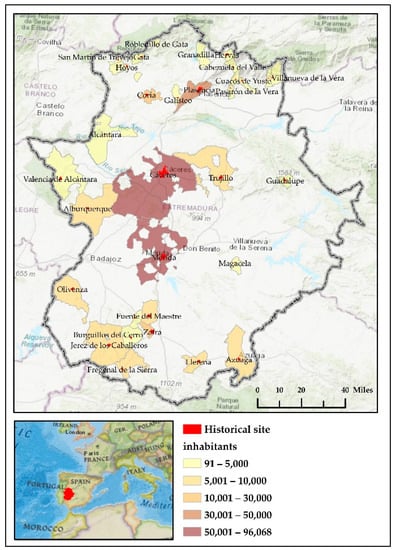 Given the huge variety of historical heritage, we have had to limit our scope to a specific area, Extremadura in Spain, using a single type of real property as a reference: Historical Ensembles. In accordance with Article 15.3 of Law 13/1985 of 25 June on Historical Spanish Heritage, this consists of the grouping of real property, which makes up a continuous or dispersed unit of settlement, conditioned by a physical structure representing the evolution of a human community as it is a witness to its culture, or constitutes an asset of use and enjoyment for the group [39].