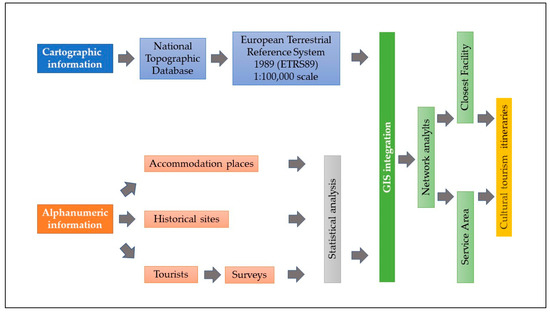 The methodology proposed for carrying out this study (Figure 2) starts by obtaining the necessary information from the aforementioned sources. The procedure followed concerned both the cartographic and the numerical databases. Using these data, a GIS project was generated using the ArcGIS v.10.5 software. The cartography supplied by the National Geographical Institute (IGN) was used, although it was necessary to georeference the accommodation available with the aim of including it in the geographic information system. In contrast, the data on tourist demand came from a survey carried out throughout 2017 in the tourist offices of Extremadura. The database created from this survey contained 13,848 records, which were filtered according to the tourism type practiced and considering only the 33 Historical Ensembles, which left 6167 cases in the sample. The results obtained were georeferenced on the municipality of the overnight stay, irrespective of whether it was a Historical Ensemble or not, although in this case, the starting point taken was the 39 municipalities with the highest number of answers, which ensured greater reliability and rigor.