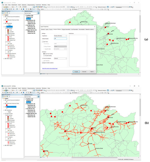 Example of service area operation. (a) Configuration of the analysis using an impedance of 20 min; (b) Result (detail). It can be observed how in an isochrone of 20 min from the main tourist centers, there are historical ensembles that are part of one or several routes. In the same way, some more distant Historical Ensembles (northwest) can also be detected.