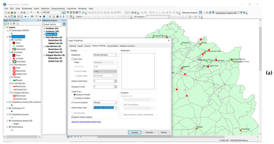 The procedure for creating a service area from a road network has been sufficiently described in the literature [78,79,80] and in the assistance provided by the software used [81], although a rough outline is given in Figure 3a,b.
