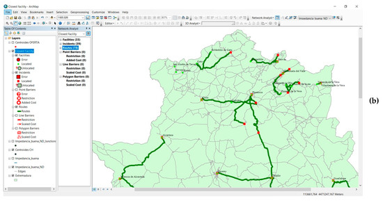 The operation of the technique is simple as once the topology of the road network has been set up, it is only necessary to specify the number of locations near the areas of origin that must be sought (Figure 4a,b). In this case, the aim is to ascertain the two Historical Ensembles nearest to the main tourist points of Extremadura, supposing that given the average stay of less than 2 days [86], tourists cannot devote much time to internal travel.