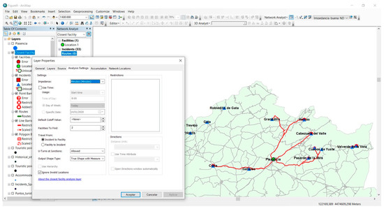 After this confirmation, the possibility of creating tourist itineraries was considered by taking as a reference the most visited municipalities and the Historical Ensembles that would be viable, as it has been shown that tourist mobility patterns can be extracted [73,74,75,76]. From all of this, it can be gathered that the most visited municipalities (origin) and the Historical Ensembles (destination) were taken as a reference to establish the itineraries. In order to calculate the impedance on each of the 8969 road sections, we decided to use the most usual average legal speeds for each road type. In this manner, in the case of dual carriageways, the speed was adjusted to 120 km/h (74 mph), A roads to 100 Km/h (62 mph), and minor roads to 90 km/h (55 mph), while in built-up areas, it was limited to 50 km/h (31 mph). The impedance values obtained were corrected by means of the travel time provided by the Viamichelin application [77] due to its greater precision. The main criteria taken in this route generator were as follows: travelling from the center of the city of origin to the center of the city of destination; taking Sunday traffic into account; and specifying 10 a.m. as the time of departure. Once the speeds had been established and the impedance obtained for each section, we constructed the network topology on which the two techniques included in the network analysis module integrated in ArcGIS were applied. These are the service area and closest facility.