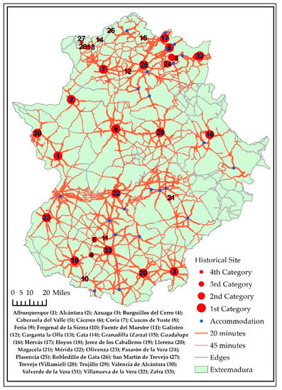 Historical Ensembles act as true centers of tourist attractions. However, their capacity to attract visitors lies in their proximity to the main centers of tourist attraction in Extremadura, in addition to their importance and the confluence of further recognition by the Ministry of Culture and UNESCO. For this reason, the service area was calculated with two different isochrones corresponding to one-way travel lasting 20 and 45 min. Moreover, it should be pointed out that certain Historical Ensembles coincide with the most visited centers; in these cases, the travel time was considered to be zero. Likewise we included all centers that are Historical Ensembles, but at a greater travel distance. Four categories were therefore recognized according to the travel time from the most important tourist centers (Table 4).