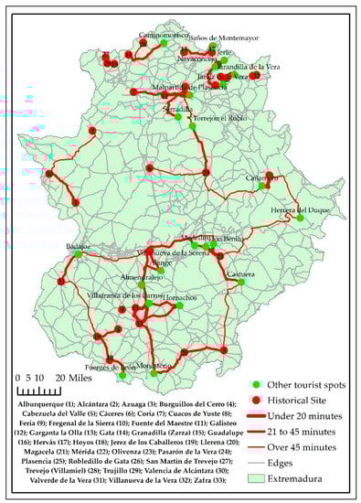 In order to create them, the first reference taken was the location of the main tourist points of Extremadura and subsequently, the maximum travel time to the nearest Historical Ensembles, taking the isochrone of 60 min as the limit (Figure 5). This spatial configuration of the network allowed for the creation of an initial group of itineraries concentrated on the main tourist points and a second group that started from the remainder of the important tourist centers. The main limitation is that the routes must be generated by taking a single origin with multiple destinations. Due to this, in order to establish them correctly, we took each of the tourist points as an origin and all of the Historical Ensembles as destinations.