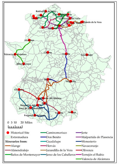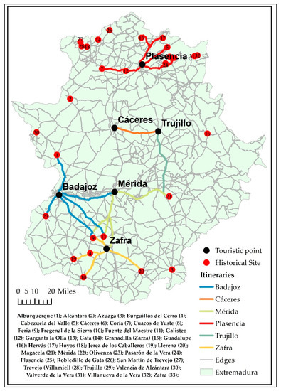 The Historical Ensembles that can most benefit from the creation of tourist itineraries are those linked to the tourist points that capture the most demand and are the nearest. These were Cáceres, Mérida, Badajoz, Plasencia, Trujillo, and Zafra (Table 7).