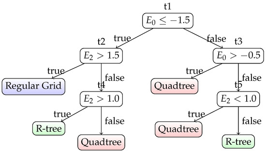 On the contrary, if is false, then the dataset has a skewed distribution in the reference space. In this case the test on is applied to determine if the dataset is clusterized in some way. In particular, if is true, then the Quadtree-based grid will be chosen; conversely, the final test on is used to determine some degree of connectivity and to choose between a Quadtree or an Rtree index.