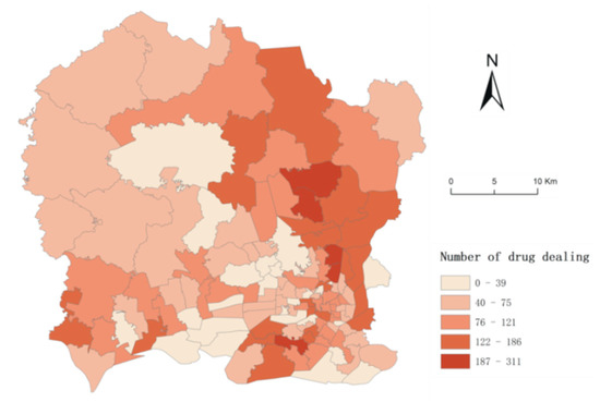 The descriptive statistics of explanatory variables and dependent variables are shown in Table 1. The spatial distribution of drug dealing is presented in Figure 1. There there were spatial clusters formed in the east and southwest of the city (Moran’s I: Z-Score: 4.1168, p-value: 0.0000).