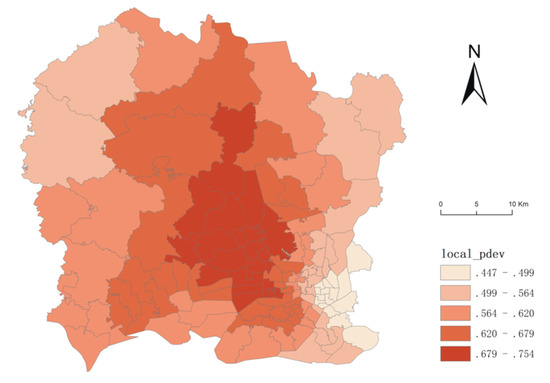 The spatial patterns of model residuals are presented in Figure 2, suggesting no spatial autocorrelation (Moran’s I value: −0.0286, Z-Score: −1.142, p-value: 0.2536). Local percent deviance explained in GWPR is the counterpart to in a linear model, which indicates the spatial variation in explanatory power. The best fit of the model, as shown in Figure 3, is the center of the study area.