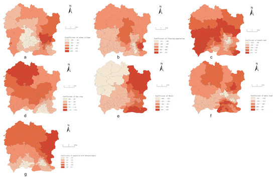 The coefficients of floating population ranged from −0.014 to 0.015. In previous studies, the impact of floating population on crime has been inconsistent. Some studies found that floating population had a positive impact on crime [38,39], but others had different findings [40]. For example, the impact of floating population on crime varies by the origins of the migrants [21]. The p-values confirmed that floating population has a positive impact on drug dealing. The spatial distribution of the coefficients (Figure 4b) demonstrated that the floating population had a greater influence in the city center than in the peripheral areas. The high residential mobility of a floating population is one of its important characteristics, because they usually have to move frequently to make a living. The increase of residential mobility would lead to an increase of property crime [41,42], whereas it had a negative impact on sex offenses [43]. The findings of this study showed that residential mobility had a positive effect on drug dealing.