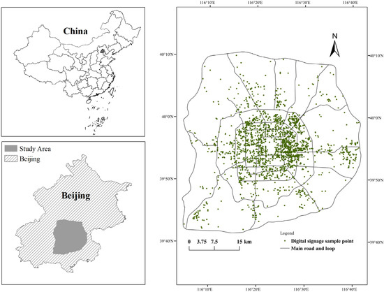 - Zhang, X.; Ma, G.; Jiang, L.; Zhang, X.; Liu, Y.; Wang, Y.; Zhao, C. Analysis of Spatial Characteristics of Digital Signage in Beijing with Multi-Source Data. ISPRS Int. J. Geo-Inf. 2019, 8, 207. [Google Scholar] [CrossRef]