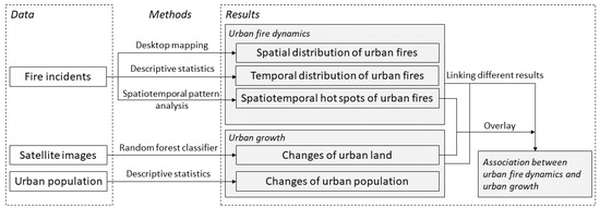 The research framework is presented in Figure 1. Using historical fire incidents, satellite images and urban population data, the urban fire dynamics and urban growth, particularly urban expansion, were analysed separately using a range of methods including descriptive statistics, desktop mapping, spatiotemporal pattern analysis and land use/cover detection with random forest classifier. Then, the results of urban fire dynamics and urban growth were linked together to examine the potential associations between the two. Those would be detailed in the remainder of this section.