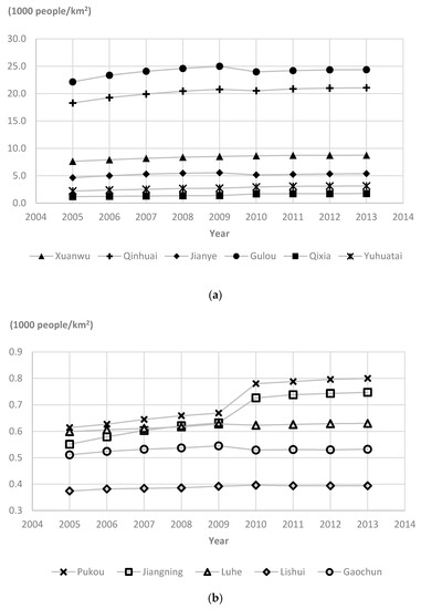 Variations of population density in urban districts (2005–2013): (a) city proper and (b) suburbs.