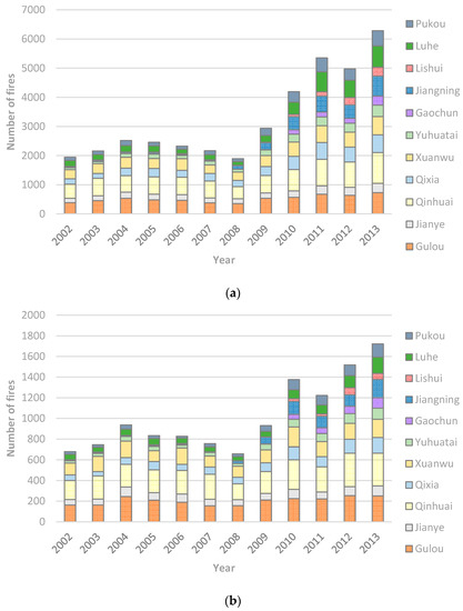 Figure 3, Figure 4, Figure 6, Figure 7, Figure 8 and Figure 9 suggest that the variations presented in Figure 10 were virtually far more homogeneous across space. First, the high-density population in the city proper (Figure 3a) suggests that it was not surprising that the six central districts remained as the areas with the highest fire incidences (Figure 4 and Figure 6), particularly Gulou and Qinhuai, which ranked as the top two in both the number of fires and population density during the entire study period. This might also explain the existence of most “intensifying”, “persistent” and “sporadic” fire hot spots in the city proper (Figure 7). In addition, Qixia and Yuhuatai accounted for the most urban expansion within the central city (Figure 8 and Figure 9), which, along with the population growth, might explain why most of the “new” and “emerging” fire hot spots in the city proper were found in those two districts (Figure 7). Further, the two suburban districts, Jiangning and Pukou, had a sharp population increase in 2010 (Figure 3b). Meanwhile, Figure 8 and Figure 9 indicate they both had experienced major urban land growth, ranked the 1st and the 3rd, respectively, among all districts. Thus, it is not surprising they contained most of the “new” and “emerging” fire hot spots in the suburb.
