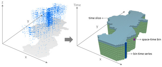 A typical space-time cube can be illustrated by Figure 5, where x and y axes define the spatial extent of the study area and the z axis represents the time scale under concern. Within the cube, the observations (i.e., fire events) were aggregated in both spatial and temporal dimensions, i.e., counted for each space-time bin—a container covering a unit-area in space with the height defined by a unit time-period. A time slice consisted of all bins at the same time period and a bin time series contained all the bins sharing the same geographic location across time. In this case, the spatial extent of each bin was 500 m × 500 m, which was about the size of a street block in Nanjing, and one year was adopted for the time-step interval as the urban expansion detection is on a yearly basis. As a result, the obtained space-time cube included 328,068 space-time bins, covering 27,339 grids in space and 12 periods in time.