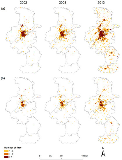 Based on Figure 7, Figure 11 further overlays the locations of “new” and “emerging” fire hot spots with the urban land changes during the associated periods. Here, the periods of urban expansion included one more year than those adopted in the hot spot definition in order to obtain more accurate estimations of urban land changes. Thus, Figure 11a,b presents the urban expansion during 2010–2013 and 2008–2013, respectively. The value in each grid cell represents the share of new urban land, with darker colours indicating higher degrees of urban expansion. It could be observed that most hot spots actually were not located at the places where more urban land was developed. For the locations covered by “new” hot spots in Figure 11a, the average share of new urban land was about 2.9% and 1.2% for total and dwelling fire, respectively, both less than the mean value of the entire city, 3.5%. In addition, over half of the places where “new” hot spots are located did not have any new urban land: 52.8% and 79.8% for total and dwelling fire, respectively. As involving a longer period, the “emerging” hot spots in Figure 11b seemed related to more urban land changes at the corresponding locations, with the average share of new urban land 9.7% and 5.9% for total and dwelling fire, respectively, where only the former was higher than the average value of the entire city, 8.6%. Additionally, compared with “new” hot spots, “emerging” hot spots had less locations containing zero new urban land, 33.8% and 50.0% for total and dwelling fire, respectively.