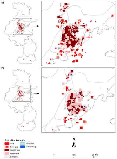 Regarding the spatiotemporal pattern of fire incidents, several types of fire hot spots are defined for the bin time series at location i based on the obtained and values, which is summarized by Table 1. First, if is statistically significant and positive, considering the length of the study period (i.e., twelve years) as well as the transitional year 2008 (see Figure 4), “new” and “emerging” hot spots are defined for the locations where fire hot spots (defined by ) were only found for the most three (2011–2013) and five (2009–2013) years, respectively. In contrast, “historical” hot spots only occurred during 2002–2008 and cover at least two periods for the same location. Similarly, “sporadic” hot spots relate to a minimum of two periods but must include periods before and after 2008. Further, another three categories can be defined by incorporating : “intensifying”, “diminishing” and “persistent”, which all cover at least ten periods including the last one but only the first two categories have statistically significant . That is, if is significant, positive values indicate an ascending trend, thus implying “intensifying” hot spots, and negative values suggest a descending trend, thus implying “diminishing” hot spots.