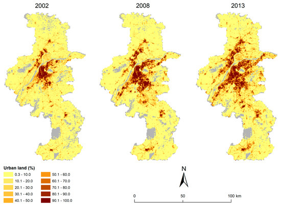 Temporal variations of urban land (2002–2013).