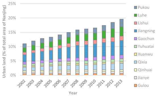 Figure 9 further describes the changes of urban land over time for the entire city as well as for each urban district. The urban land of Nanjing grew steadily during 2002–2013, with the area increasing from 12.2% of the entire city in 2002 to 18.6% in 2013. Obviously, the urban expansion primarily occurred in the suburb, and its share of the overall urban land increased from 65.5% in 2012 to 70.6% in 2013, over two times that of the city proper. Particularly, three districts, Jiangning, Luhe and Pukou, have expanded rapidly, the urban land of which increased by 98.8%, 110.2% and 84.9%, respectively, compared with that in 2002. In contrast, the increase of urban land in the city proper is much less except Qixia and Yuhuatai, where the urban land increased by 85.1% and 66.7%, respectively. Gulou had the least urban land growth across all urban districts, about a 10.0% increase compared with that in 2002.