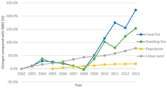 Considering the two major consequences of urban growth—population increase and urban expansion, this section will examine the association between urban fire dynamics and urban growth from those two perspectives at three spatial scales: the entire city, urban districts and the finer spatial scale adopted in the cluster analysis (500 m × 500 m). Specifically, Figure 10 describes the changes of urban population, urban land and urban fires for the entire city, in comparison with those at the beginning of the study period, 2002 (the population data were compared with that in 2005 due to data availability). The relevant association was further explored by linking Figure 3, Figure 4, Figure 6, Figure 7, Figure 8 and Figure 9 with respect to the eleven urban districts. Finally, the association between urban fire hot spots and urban expansion since 2008 was investigated at a finer spatial scale (500 m × 500 m) by Figure 11.