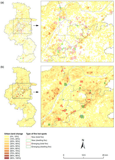 Comparison of urban fire hot spots and urban land changes: (a) “new” hot spots vs. urban land change in 2010-2013 and (b) “emerging” hot spots vs. urban land change in 2008–2013.
