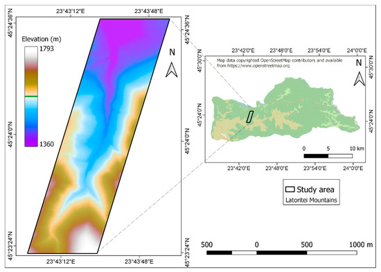 The analysis was carried out in a test site with an area of 1.6 km2, located in the Latoriței Mountains of Romania, along the Bora River valley (Figure 1). Most of the area is covered with forest vegetation, mainly spruce (90 percent) and pine (10 percent). The majority of tree stands have an age of 90–95 years, with younger stands (55–75 years) also being present to a smaller extent. The most recent forest management plan indicates a high canopy density, with an average value of 0.8. The area is characterised by steep, mountainous relief, with ground slope having an average value of 26 degrees.