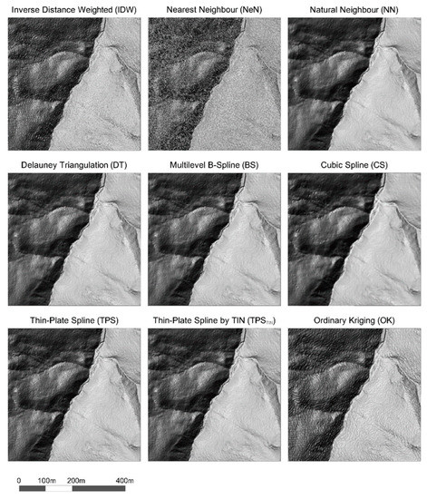 In addition to the quantitative analysis of accuracy, we propose that a qualitative (or visual) analysis of generated surfaces is also of interest, especially in cases where interpolation methods do not have a significant difference in terms of RMSE values. A hillshade generated from the final DTMs (at the 0.5 m resolution) for a subset of the test area is presented in Figure 2. It is apparent that most interpolated surfaces have some degree of visual artefacts. Most distinctive artefacts are present for interpolation with NeN (which has a significant noise-level), DT (mostly in areas of lower point density, where the facets of the initial TIN are larger), IDW (also predominantly in areas of low point density) and CS. Visual analysis shows that spline-based methods generate smoother surfaces, closer in appearance to the real ground surface.