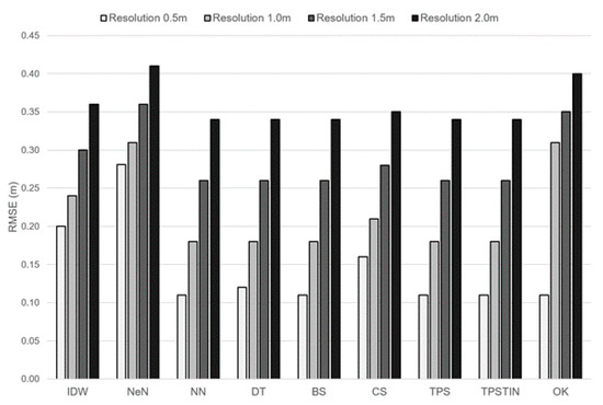 RMSE values for each model resolution (0.5, 1.0, 1.5 and 2.0 m) are presented in Figure 3. For each interpolation algorithm, a lower general accuracy is observed for coarser resolutions. In other words, for a specific resolution, the relative performance of tested algorithms is for the most part similar.