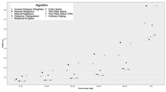 Variation of interpolation accuracy by ground slope class (model resolution: 0.5 m). For clarity, points are horizontally offset.