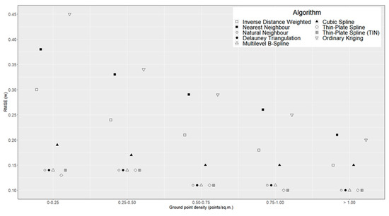 The next external factor that was considered is the ground point density (Figure 5). While the reduction of point density has a noticeable effect on RMSE for NeN, IDW and OK algorithms, the other interpolation methods that were tested have a lower variation of RMSE across point density classes. A higher variance of RMSE values between interpolation methods for lower point densities is also reported by [72]. For most algorithms, we find a significant negative correlation between mean RMSE values and point density categories (Table 5), with the sole exception of TPS (r = -.87, p-value > 0.05).