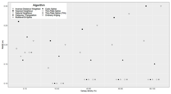 Leaving aside the lowest canopy density class (0–10 percent) due to its unreliability (a higher 0.95 confidence interval due to a low number of validation points), it is apparent that, generally speaking, canopy density has a similar effect as ground point density (Figure 5), except inversed (since an increase of canopy cover density should cause a decrease of ground point density). Therefore, if we look at this two factor in conjunction, we can see that: (1) several algorithms are not affected by changes in ground point/canopy density—NN, DT, BS, TPS, TPSTIN; (2) some algorithms have a decreased performance at higher canopy density/lower ground point density—NeN, OK, IDW and (3) the rest of the algorithms seem to have random changes in terms of accuracy between classes of canopy density/ground point density.