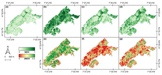 Normalized difference vegetation index (NDVI) of the study area in: (a) September 2017, (b) August 2017, (c) September 2018 and (d) September 2019. The difference NDVI (dNDVI) compared to September 2017 in (e) August 2017, (f) August 2018 and (g) August 2019.