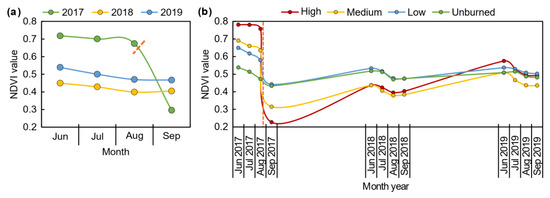 Mean values of the normalized difference vegetation index (NDVI) of the study area (a) and for each severity level (b) in the months of June, July, August and September of 2017, 2018 and 2019. The orange dashed line marks the fire disturbance date.