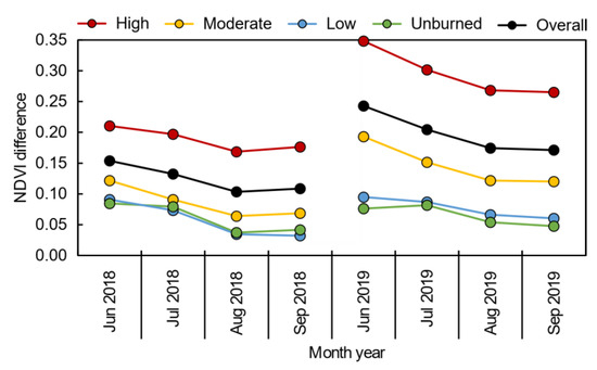 When analyzing the post-fire dNDVIs (Figure 5) relating the differences in the first post-fire data (September 2017), a similar trend was observed. By analyzing the mean differences per year, an overall mean difference of 0.12 was verified in 2018, while in 2019 this difference was 0.20. In both years the same trend was verified, with the higher differences verified in areas with high severity, followed by moderate-severity areas. Both unburned and low-severity areas presented lower differences, with a mean difference of 0.06 for the two classes in 2018, an increase to 0.08 in 2019 for the low-severity areas and the same value maintained for the unburned area. The values declined from June to August and remained similar in September. When comparing July 2018 to July 2019, an overall increase of 0.09 was verified in the mean dNDVI values, representing increases of 0.14, 0.07, 0 and −0.01 for high, moderate, low-severity and unburned areas, respectively. A visual representation of the pre- and post-fire dNDVIs for the two subsequent years is presented in Figure 3e–g.