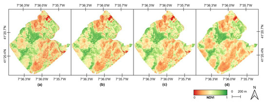 As mentioned in Section 2.3.3., the UAV-based multispectral data covered 116 ha of the study area. This was used to perform a comparison between the Sentinel-2 NDVI and the UAV-based NDVI at different spatial resolutions (Figure 6). The statistics of the different spatial resolutions of the UAV NDVI (Table 2) were similar in their mean values, while the minimum, maximum and standard deviation values tended to be greater for higher spatial resolutions. In regards to the NDVI computed from the Sentinel-2 dataset, a small difference was verified for the mean value, while the minimum, maximum and standard deviation values were similar to the UAV NDVI at a 10-m spatial resolution (Figure 6c).