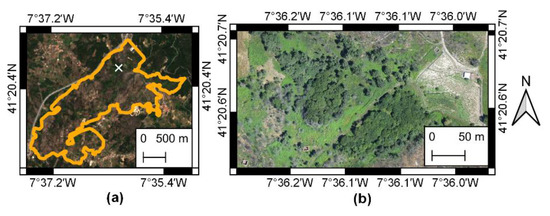 The study area, highlighted in Figure 1, is located in the north-eastern region of Portugal within the municipality of Sabrosa (41°20’40.4″ N, 7°36’04.5″ W), near the villages of Parada do Pinhão and Vilarinho de Parada. This area was severely affected by a wildfire that began at 12:59 p.m. on 13 August 2017 and was reported as extinguished at 03:16 a.m. on 14 August 2017 [39]. The area is characterized by a warm and temperate climate, an average annual temperature of 13.1 °C and an annual precipitation averaging 1139 mm. July and August are the months with the highest mean temperatures (21 °C) and lower precipitation (28 mm). This area was selected due to its easy accessibility and representativeness, since the species in the area are common for the region. It is mostly populated by maritime pine, deciduous species such as Quercus pyrenaica and Castanea sativa Mill. and some riparian species, shrubland communities and parcels used for agriculture and silviculture purposes. Moreover, the burned area was greater than 100 ha, which fit the majority of the fire events (93%) that occurred in Portugal during 2017 [6].